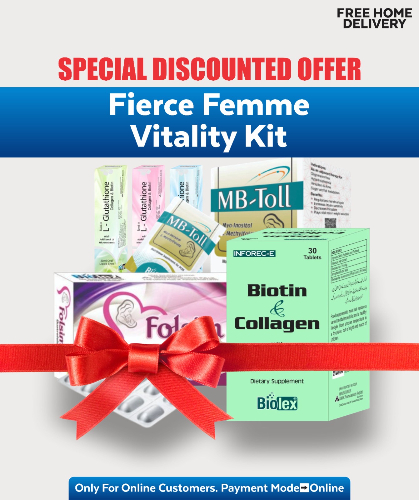 L Glutathione Collagen & Biotin(Femi 10 oral shots) + INFOREC-E + Folsim + MB-Toll: